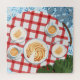 Charming, cozy Sunday brunch with friends. Cafe table flat lay with bundt cake and cappuccino coffee for two on a table with a red & white chequered table cloth. Monstera plants and traditional Spanish tiles on the floor. I'd love to see this design out in the wild; tag me on Instagram @parry_vegan