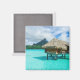Aimant photo souvenir d'un bungalow en lune de miel au toit de chaume surplombant l'eau dans un resort dans la lagune turquoise et limpide de l'île tropicale Bora Bora avec vue sur le Mont Otemanu près de Tahiti en Polynésie Française.