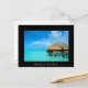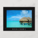 Carte postale avec un bungalow sur l'eau en lune de miel dans un resort de luxe dans le lagon bleu clair de l'île pacifique de Bora Bora, près de Tahiti dans l'archipel de Polynésie française avec une frontière noire et le texte : 'Bora Bora'.