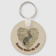 This inexpensive keychain features a nature photo that captures an adorable wild desert bunny sitting inside a large heart. The brown rabbit with his long ears is resting on a dirt path. The large heart shape surrounds the bunny with "Bunnies Make Me Smile" curved under the photo. All text can be customized if you desire. A pattern of bunnies appears on the back.