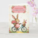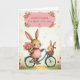 This card shows two rabbit-like friends riding together through a sunny spring scene, with a tender closeness in the way the smaller one leans forward to peek out 🐰. A larger brown-furred character with dark eyes and rosy cheeks pedals a teal bicycle, wearing a soft pink patterned pinafore while holding a bouquet of coral roses close to their chest. In the front wicker basket, a smaller companion with a little red bow sits snugly, looking up as if sharing a quiet, happy moment 🐇. The wheels roll along a winding golden path bordered by green grass and scattered red flowers, suggesting a gentle outdoor stroll. Behind them, the sky and fields blend into pale yellows and greens, dotted with small pink starburst shapes that add a light, celebratory touch. Near the top, the main text sits inside an ornate banner with curled edges, and extra roses decorate the sides of the frame. The banner is centered in the upper portion, with the lettering set neatly against the light background for easy reading. The teal bike frame, spoked wheels, and woven basket stand out against the soft pastel backdrop and the golden path below.