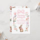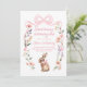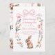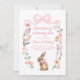 Some bunny is turning one invitation with pink bow and wildflowers, hand drawn bunny and bow.