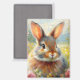 This nature-themed magnet features a mildly impressionistic oil painting artwork of a plump bunny in a field or meadow with beautiful flowers. The colors are soft and light, a mixture of earthy and neutral tones with pinks and yellows, making it perfect for spring, Easter or summer.