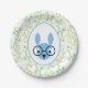 Un adorable lapin aux lunettes orne cette assiette de fête printanière en bleu et vert. C'est un excellent choix pour le printemps et la saison de Pâques. Un bon choix pour les fêtes d'enfants. Des serviettes en papier assorties sont également disponibles dans cette conception. Image de Bunny avec l'aimable autorisation de vecteezy.com.