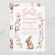 Un lapin tourne une invitation avec un arc rose et des fleurs sauvages, du lapin dessiné à la main et de l'arc.
