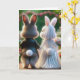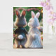 Two bunnies dressed as a bride and groom stand hand in hand on a garden path surrounded by vibrant flowers.