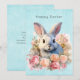 A flat Easter card with a watercolor image. A white gray bunny rabbit surrounded by a garland of pink and peach roses. For bunny lovers and Easter themes and birthdays and showers.