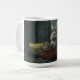This mug shows a darling brown and white Easter bunny in the woods with a basket of surprises.