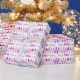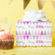 Birthday bunting triangular flag style patterned wrap ideal for girls birthdays or other occasions. Personalize with your own birthday age and letters for your name on the bunting currently reads Dorothy Happy 65th Birthday. Wrapping paper in colourful pink, purple, golden and blue grey pastel shades on white. Designed by Sarah Trett.