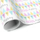 Birthday bunting triangular flag style patterned wrap ideal for girls birthdays or other occasions. Personalize with your own birthday age and letters for your name on the bunting currently reads Annette Happy 50th Birthday. Wrapping paper in colourful pastel shades on white. Designed by Sarah Trett.