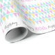 Everyday bunting triangular flag style patterned wrap ideal for girls birthdays or other occasions. Personalize with your own birthday age currently reads Happy 60th Birthday. Wrapping paper in colourful pastel shades on white. Designed by Sarah Trett.