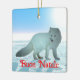 White on white. A digital painting of an Arctic Fox, Vulpes lagopus, on the polar ice. The sun hangs low in the bright blue arctic sky. Do not stare at the sun as it can harm your eyes. Italian text reading, "Buon Natale" appears in red. The Arctic Fox is comfortable in deep cold; it does not begin to shiver until temperatures drop to about −70 °C (−94 °F) due to its dense, multi-layered fur. Other adaptations to a frigid climate include fur on the soles of its feet, short ears, and a short muzzle. Arctic foxes live in burrows, in a blizzard they may tunnel into the snow to create shelter. The coat of the Arctic fox, sometimes blue-grey, is very effective winter camouflage. The natural hues allow the animal to blend into the environment. During the short warm season its coat changes to brown or grey, again acting as camouflage in tundra rocks and plants. During the winter, when prey is scarce, the foxes follow hunting Polar Bears on the ice pack feeding on scraps. During the summer the eat rodents, birds, eggs, and even fish. They will also feed on berries and seaweed. Arctic Foxes have extremely keen hearing, aided by their wide, front-facing ears, which allow them to locate the precise position of their prey beneath the snow. If it hears something moving under the snow it leaps into the air and pounces, punching through the snow to catch its prey. The range of the Arctic Foxes is circumpolar; they can be found throughout the far north. The only land mammal native to Iceland, it arrived by walking oversea ice at the end of the last ice age.