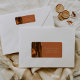 Le bord gauche de cette élégante étiquette d'adresse de retour de faire-part de mariage moderne comporte une bordure d'aquarelle orange brûlée, recouverte d'une parties scintillant en faux or. Le texte personnalisable combine écriture manuscrite couleur or pâle et polices de cuivre sur un arrière - plan orange brûlé.