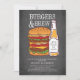Burgers Chalkboard modernes et amusants & préparation barbecue brasserie invitation dîner avec une bouteille de bière avec un énorme hamburgers mis sur un arrière - plan noir de tableau noir et un chiffon rouge assorti retour pour une touche spéciale.