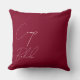 Elevate your bachelorette weekend decor with this elegant burgundy throw pillow from the Camp Bride collection. Featuring modern script typography in blush pink, this chic and customizable pillow is perfect for adding a personal touch to your celebration. Ideal as a keepsake, gift, or cozy addition to your glamping adventure, it complements the rest of the Camp Bride suite beautifully. Personalize with the bride's name to make it truly special!