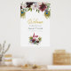 Trendy bordo - marsala and navy blue wine themed peafowl wedding welcome poster with accents of dusty blue, blush pink, plum and rose gold with wild woodland forest eucalyptus greenery.