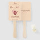 A beautiful wedding hand fan, this item displays "Love Never Fails" written beautifully using burgundy lettering on a peach background. Under the heading is a lovely bouquet of burgundy flowers. Then at the bottom, is the couple's name, venue, and wedding date presented in charming font. The back also has a peach background, customize yours today!
