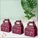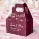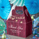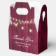Rustic burgundy wedding thank you favour box featuring string lights on a barn wood background.