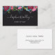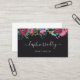 Black business card for a wedding planner, event stylist, makeup artist, hair stylist or similar, with roses, berries, leaves, and other flowers in burgundy, blue, green, pink, and orange at the top of the card. Personalize with your name in a charming white script. On the opposite side, add your contact information in a clean modern font.