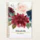 This design features an elegant, stunning, and a vibrant luscious watercolor navy blue burgundy merlot floral blooms arrangement and can be personalized with your name and year of your planner.