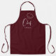 Custom chef apron feature cute chef script and hat with personalized name on burgundy red background. Great personalized chef apron.