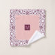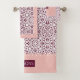 Burgundy and white damask pattern and blush pink scalloped borders Bath Towel Set. The bath towel features an elegant burgundy red and white damask pattern and pink bands on the short sides with scalloped edges. There is also a frame with your family name. The hand towel showcases a scalloped border around it while the whash cloth is blush pink in the centre with a burgundy damask border and your monogram. You can personalize it with your family name and monogram.