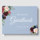 This guestbook features beautiful watercolor flowers with a burgundy dusty blue floral theme. Feel free to personalize the text and colours.
