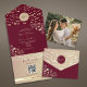 Elegant all-in-one wedding invitation with a romantic burgundy and gold floral design, glowing string lights, and modern script accents. Features a round monogram seal, photo panel, and built-in RSVP with QR code. Ideal for rustic or fall weddings with a stylish tech-friendly twist.