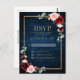 Watercolor burgundy red navy blush pink floral wedding RSVP postcard template with Gold frame and golden lettering with green botanical foliage and eucalyptus leaves in navy blue background. This beautiful easy to customize design can match easily with your wedding colours, styles and theme and it is a perfect choice for fall midsummer or winter weddings. You can find more matching designs from my store or contact me if you need any help in design customization.