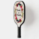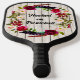 This pretty woodlook pickleball paddle has a watercolors floral wreath of burgundy, pink, and cream roses with purple and orange feathers with green leaves over a light woodgrain slats background with black customizable lettering on the front and back. The front side says, "Hooked on Pickleball" and the back says, "Paddle Pro" but you can change either side to say whatever you want them to. Email niteowlstudio@gmail.com with any request for changes.
