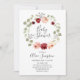 Our bohemian baby shower invitation features a watercolor floral wreath with burgundy and blush flowers with greenery.