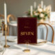 A crest monogram wedding table number featuring rich burgundy tones paired with soft gold accents for a timeless, elegant look. The refined emblem and classic layout add a polished touch to each table, making it ideal for formal, evening, or fall weddings. Designed to coordinate seamlessly with your burgundy and gold suite, this table number brings a sophisticated, upscale feel to your reception decor.