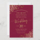 This beautiful wedding invitation features a simple yet elegant design with lacy script calligraphy on a maroon or burgundy red background and frilly gold faux foil filigree in the corners. The wording is formal, but the layout is modern and stylish.