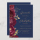 The left-hand edge of this elegant modern wedding invitation features a burgundy floral border trimmed with gold faux foil foliage. The customizable text combines gold-colored script and sans serif fonts on a navy blue background. The reverse side provides space for wedding details, along with a QR code guests can scan to visit your website and RSVP, which saves the cost of printing and mailing separate RSVP cards.