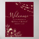Welcome your guests in style with this romantic burgundy wedding sign featuring glowing string lights, rose gold floral lace, and modern calligraphy. Perfect for rustic, fall, or evening weddings, this elegant poster sets a warm and festive tone for your celebration. Customize with your names and date.