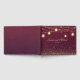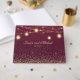 Beautiful, elegant burgundy and gold wedding guestbook with string lights and lanterns and glitter. Customizable text has the couple's names and wedding date. Contact us for help with customization or matching products.