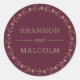 Modern burgundy and gold bride and groom name wedding envelope seals with a simple botanical wreath around the border. The minimalist design features a classic typography font for the names and a stylish calligraphy script for the centre text.