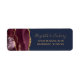 The left-hand edge of this elegant modern wedding invitation return address label features a burgundy watercolor agate border trimmed with gold faux glitter. The customizable text combines gold-colored handwriting and copperplate fonts on a navy blue background.
