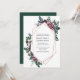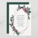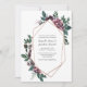 Geometric rose gold frame surrounded by watercolor flowers and greenery in colours of burgundy, grey, and dark teal green. The back of the card is dark teal green. The text boxes are easy to personalize with your own information.