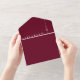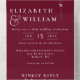 This all-in-one minimalist wedding invitation features modern typography on a burgundy background. The invitation includes a perforated RSVP card with your wedding website QR code. Designed by Thisisnotme©