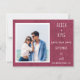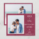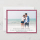 Modern photo of couple Wedding Save the Date announcement card flat card with website information, white font, burgundy textured cardstock print design.