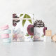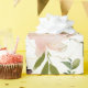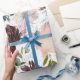 Gift wrap featuring peony flowers and baby eucalyptus leaves in accents of burgundy, wine, dusty blue and blush pink.
