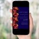 For an elegant and romantic wedding. A navy blue background decorated with burgundy, pink and peach coloured florals. Personalize and add your names and details. RSVP details