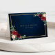 Dark navy blue burgundy floral geometric wedding Place card featuring elegant bouquet of navy blue, royal blue , white , blush, burgundy, marsala rose and sage green eucalyptus leaves and elegant gold glitter geometric neutral frame. Please contact me for any help in customization or if you need any other product with this design.