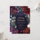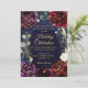 A burgundy navy Holiday party invitation featuring a watercolour painted scene of burgundy. navy and purple peonies with shimmering gold accents against a deep navy watercolour background with editable type for your occasion.