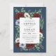 Design features a greenery floral wreath made up of silver dollar and seeded eucalyptus. Burgundy red rose peonies, dusty blue and ivory ecru or white anemones add an elegant touch. The background is a navy blue shade with a white text box. Dark grey fonts are used with a modern layout to complement the theme.