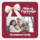A burgundy, wine red background, a cream coloured bow and text. Personalize and add a photo. Merry Christmas is written with a retro style font.
