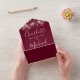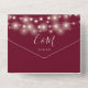 All in one wedding invitation featuring pretty string lights, mason jars, signature style names and chic typography on a burgundy background. The invitation includes a perforated RSVP card featuring a QR code. Designed by Thisisnotme©