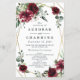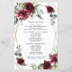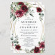 Design features a printed gold coloured geometric frame with floral elements in shades of burgundy, red and blush over greenery, eucalyptus and flower blooms.