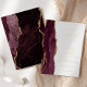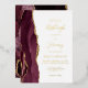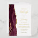 The left-hand edge of this elegant modern wedding invitation features a burgundy red watercolor agate border trimmed with faux gold glitter. The customizable text combines handwriting, copperplate and italic fonts in real gold foil on a white background. The reverse side features a matching burgundy and gold agate design.